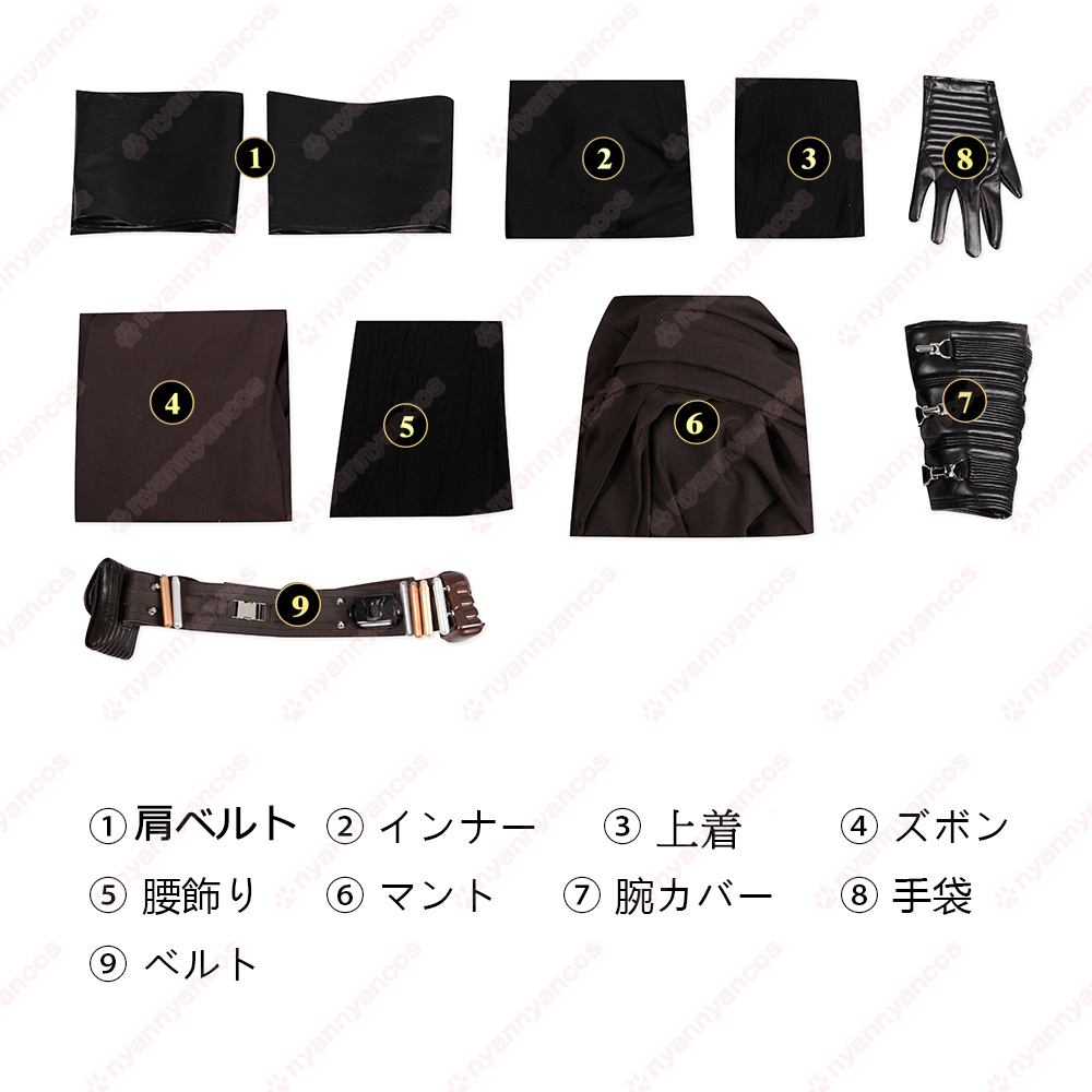 【セット内容】肩ベルト*2、インナー、上着、ズボン、腰飾り、マント、腕カバー、手袋、ベルト