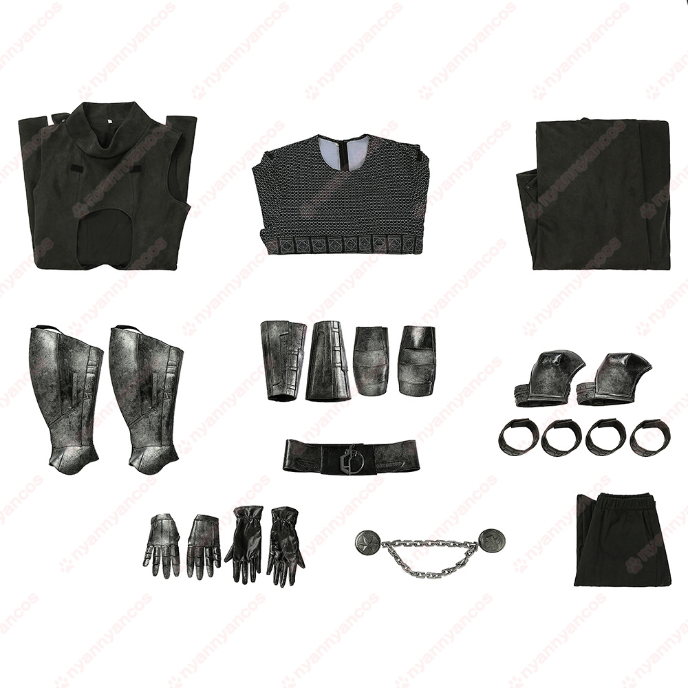【セット内容】上着、インナー、マント、膝当て*2、レッグカバー*2、アームカバー*2、ベルト、肩鎧*2、レッグバンド*4、手袋*4、チェーン、ズボン